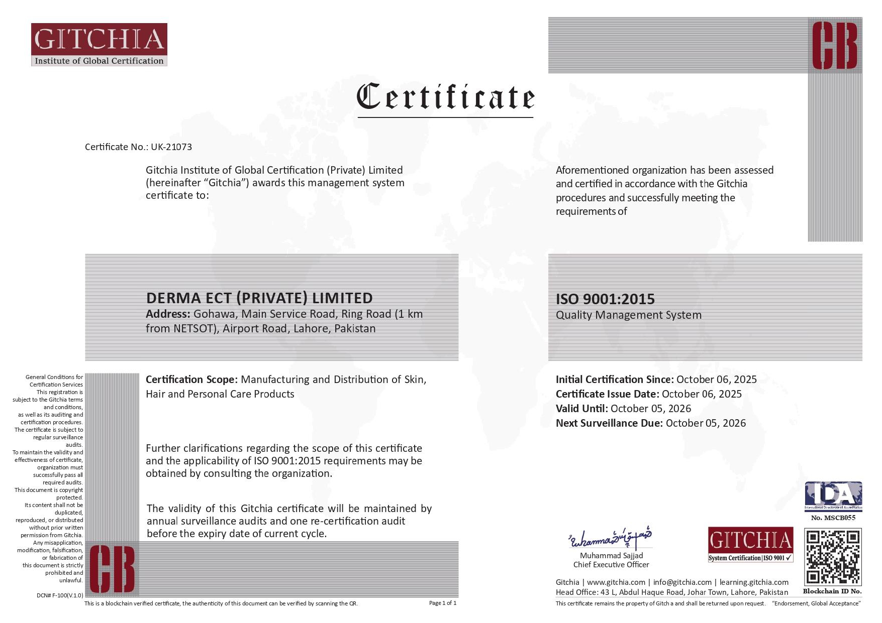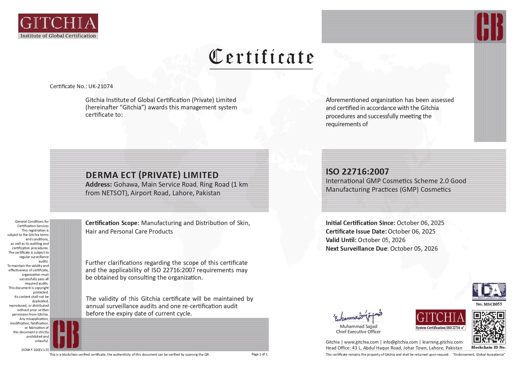 Every product manufactured under the name Dermaect represents our unwavering commitment to international standards of quality, safety, and efficacy. Our GITCHIA 22176:2007, ISO 9001:2015, and GMP Certifications stand as proof of our strong and consistent quality management systems, ensuring that each formulation meets the highest global benchmarks.