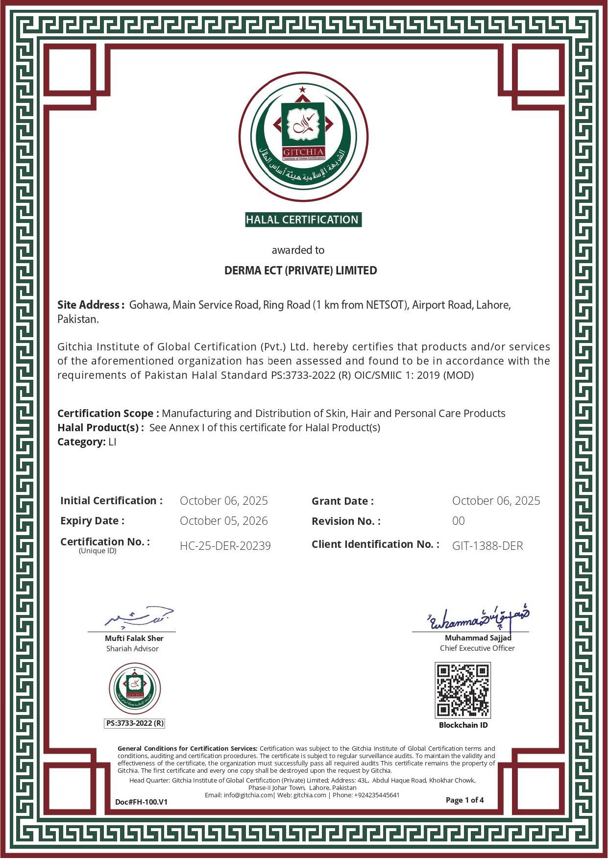 We strictly adhere to all Islamic and legal requirements, ensuring that every product manufactured and distributed by Dermaect is Halal Certified. This certification reinforces our commitment to ethical production and the trust our customers place in our brand.